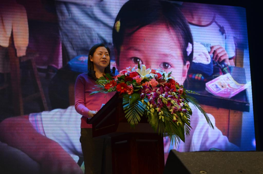 在校生代表,志愿者张亚楠分享了她与杨老师一同去万全县的经历,觉得获得的快乐要比付出的多得多。她说生命的宽度在于体验生活,作为大学生、研究生,应该多做有意义的事情,接触不同的生活,体验不同的感受。当代大学生最惭愧的生活是局限在学校,只面对同班同学,只面对书本,那只能体验生活的一小部分。通过在万全县的不一样的经历,让她更加感恩生活。公益是道德,是爱心,我们应该把爱与道德放在重要位置,即使生活艰难,也不要抱怨,要采取积极的行动,让世界因为我们的存在一点点地发生变化。她呼吁同学们都成为一个有爱有道德的人,让自己的生命与公益相连。