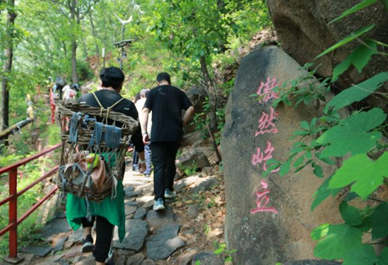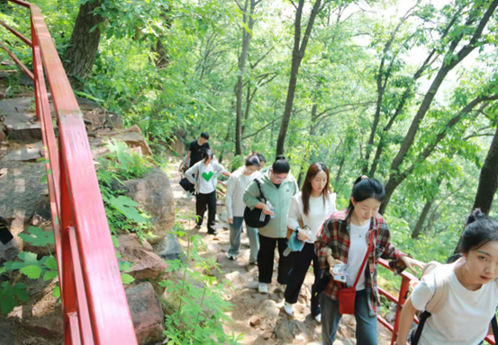 随后,师生们重走抗战小路,体验抗战时期党的领导下军民抗战的艰苦卓绝。斑驳的崖壁石刻、隐秘的战备工事仿佛将时光拉回烽火岁月,登山途中《歌唱祖国》的歌声久久回荡。